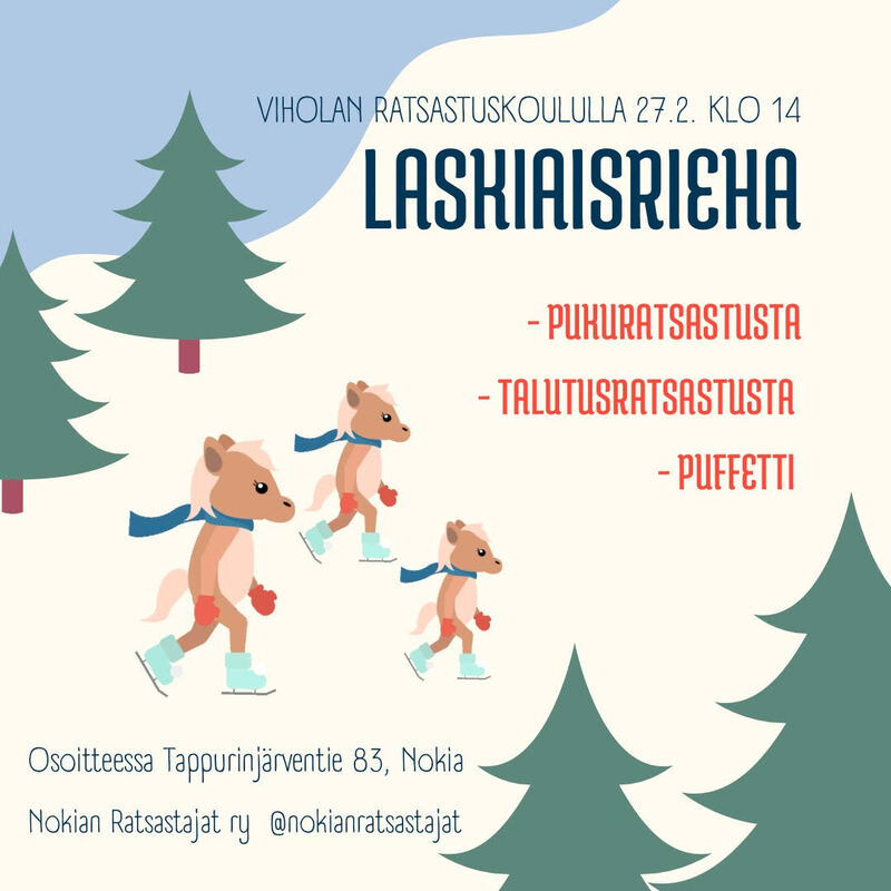 Tervetuloa laskiaisriehaan Viholan ratsastuskoululle laskiaissunnuntaina 27.2. klo 14! Pakkasraja tapahtumalle on - 15 astetta. Ks. tarkempi kutsu ohessa. Liitteet