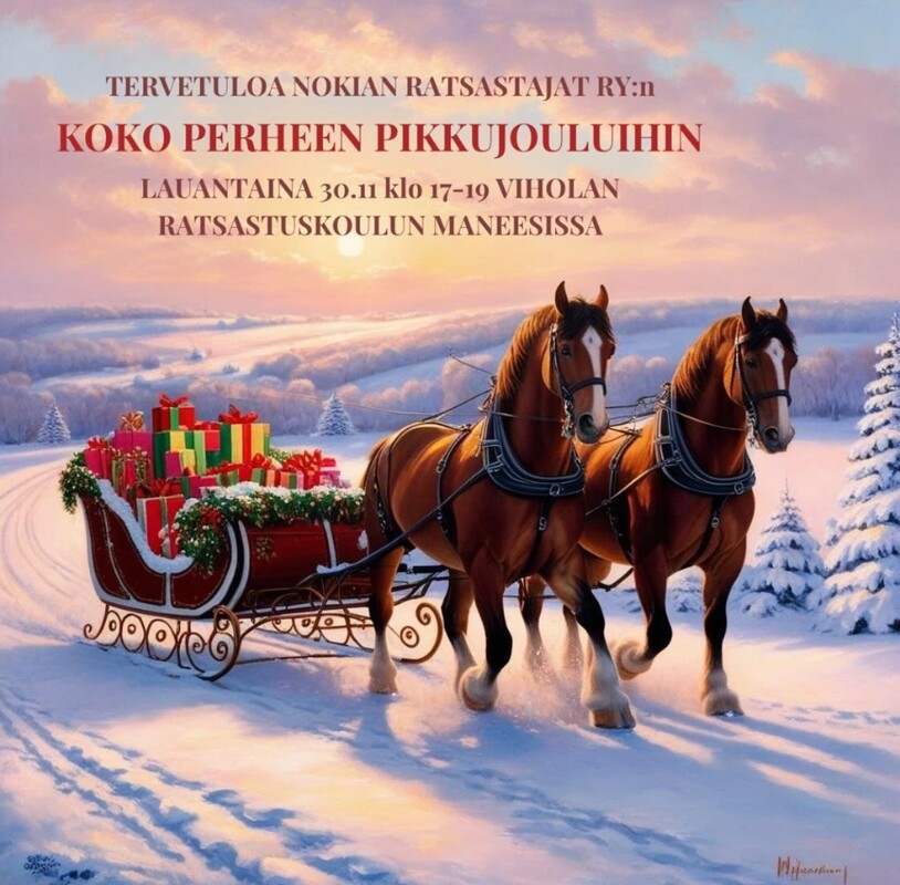 Tervetuloa koko perheen pikkujouluihin Viholan Ratsastuskoulun maneesiin lauantaina 30.11 kello 17-19. Tarjolla pientä purtavaa ja juotavaa sekä ohjelmaa. Maneesissa esterata, jota saa hypätä kepparilla tai ilman - meiltä löytyy myös kepparit lainaan. Myös jouluponi paikalla!